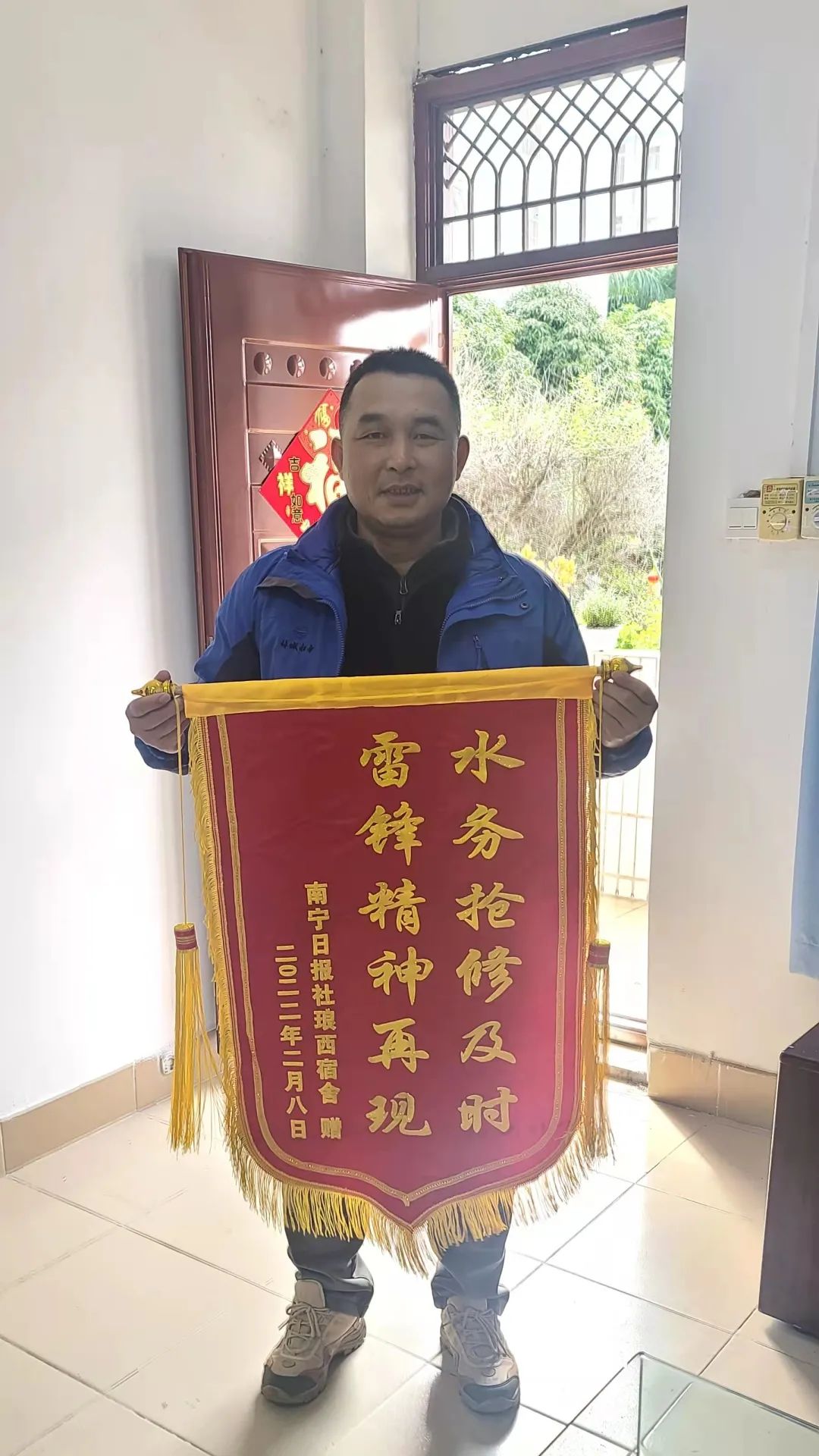 2月22日,一面寫(xiě)著“水務(wù)搶修及時(shí)、雷鋒精神再現(xiàn)”的錦旗送到管網(wǎng)管理處虎丘工區(qū)修維班副班長(zhǎng)盧繼華的手里。“謝謝你們幫我們修好了水管,大冷天的,你們辛苦了”。贈(zèng)送錦旗的是南寧日?qǐng)?bào)社埌西宿舍居民代表和物業(yè)管理公司代表,他們代表宿舍居民群眾和物業(yè)感謝綠城水務(wù)為一方百姓冷暖、小區(qū)民生服務(wù)所做的大量工作,激動(dòng)感謝之情溢于言表。