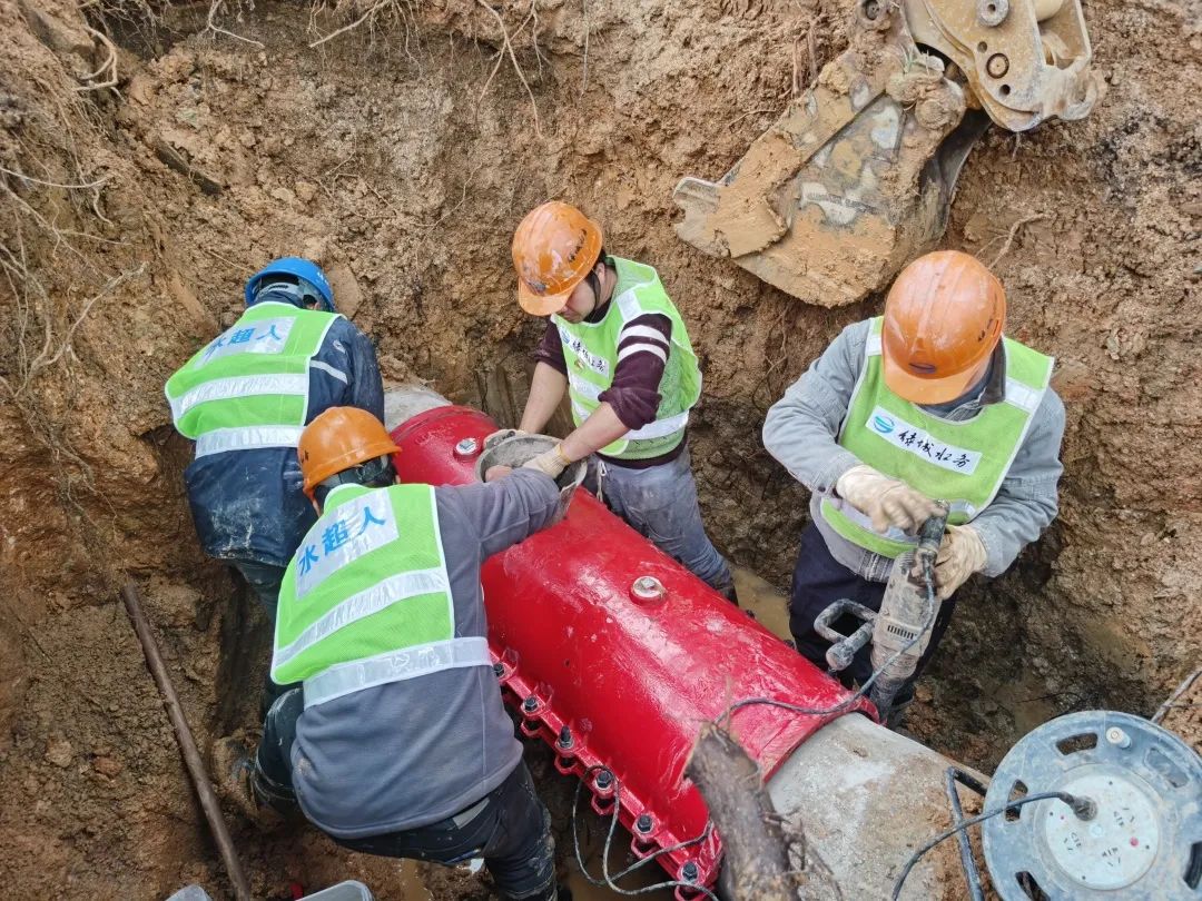 經現場勘查,確定是地下一根DN400水泥管突發爆裂滲水,“水超人”應急搶修隊員立即投入“戰斗”。“春節期間保供水刻不容緩,我們務必爭分奪秒,盡快恢復通水,將停水對市民的影響降到最低”,搶修班班長徐振峰一邊指揮搶修隊伍進行搶修,一邊緊急安排送水車確保市民應急用水。搶修隊員依據以往豐富的經驗,在錯綜復雜的地下管線中快速找到漏水點后立即開展管道修復工作。當天陰雨綿綿,現場氣溫降到10℃以下,在水中堅持作業的搶修隊員們全身濕透,為了搶時間趕進度,隊員們冒著瑟瑟寒風,在冰冷的環境下輪流上陣,從趕赴現場處置到恢復供水只用了5小時,高質高效完成了沙井大道DN400水泥管的搶修任務。今年春節期間南寧遭遇的低溫寒潮天氣給管網管理處帶來了不小挑戰,據統計,春節期間公司共出動搶修人員1934人次、搶修車輛312車次,送水車31車次,全力為城市供水命脈暢通保駕護航。