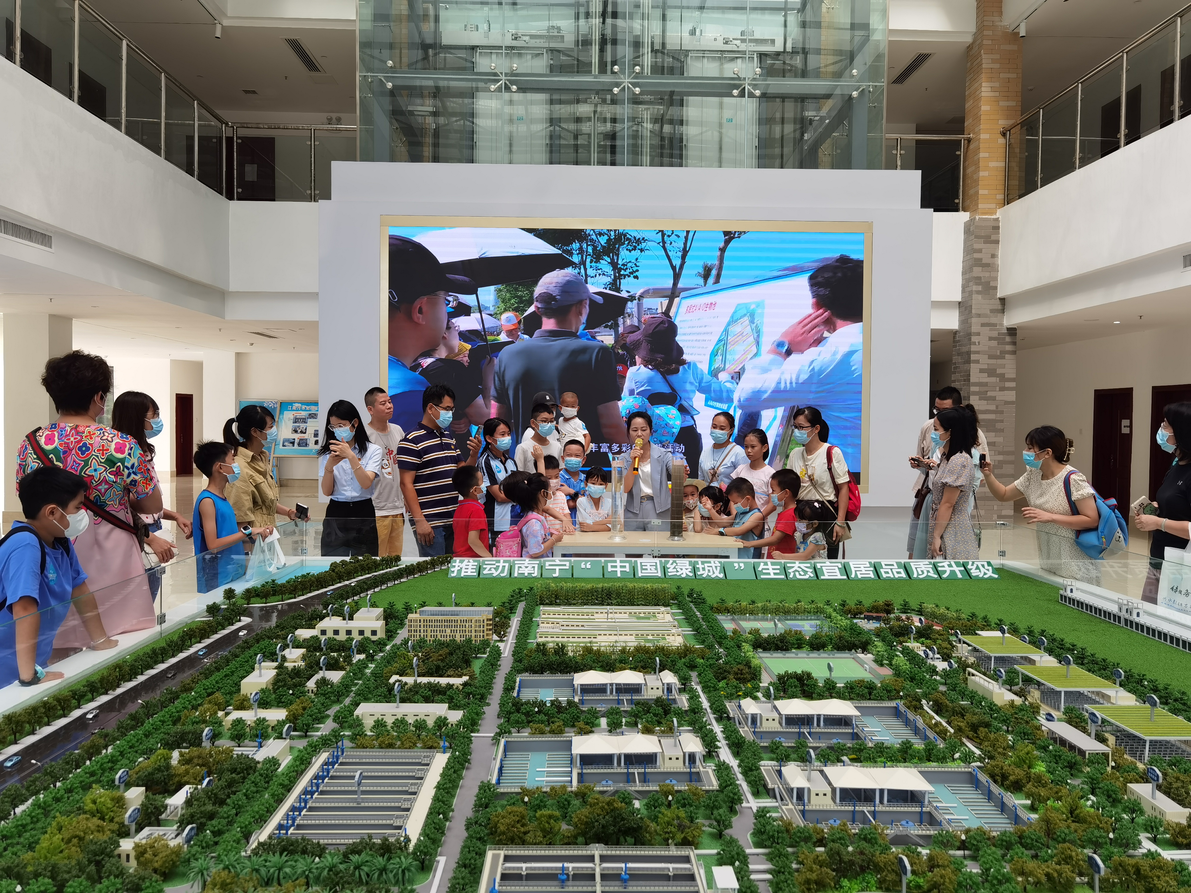 綠城水務環保科普教育基地的工作人員向大家分發了水科普知識手冊、垃圾分類手冊、節能宣傳倡議書等,還組織大家共同觀看了節水知識和創建國家文明城市視頻。在水科普展廳,“水先生”通過用水場景模型,給大家深入淺出地講解了城市水循環的整個過程:首先,從邕江取水進入城市供水廠,通過混凝、沉淀、過濾、深度處理、消毒處理等工藝后,經由供水管網輸配抵達千家萬戶,居民使用后的生活污水經污水管網進入城市污水處理廠,通過粗格柵、細格柵、生物處理、深度處理、消毒等處理工藝進行水質凈化,達標后排入邕江,而污水處理中產生的污泥則外運給專業機構經過妥善處置后進行資源化利用。