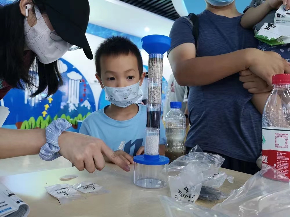 自己親自動手,把污水變成清水是孩子們非常喜歡的一個環節,F場當主持人宣布孩子們將自己動手把水凈化,孩子們爭先恐后地想要第一個嘗試。現場工作人員給每個孩子發放了一個簡易的污水凈化器,現場每個孩子和自己的家長組成一組,自己動手將污水凈化器的每一個組件組裝起來,再將直接從廠里面提取的污水倒入污水凈化器中。大家可以直觀地看到一開始渾濁不堪的污水,在慢慢經過5層凈化后,流出了較為清澈的水。