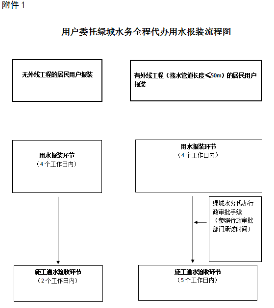 ①委托綠城水務(wù)全程代辦的,無外線工程施工通水驗(yàn)收時(shí)間不超過2個(gè)工作日,有外線工程(外線工程長度≤50m)施工通水驗(yàn)收時(shí)間不超過5個(gè)工作日,不包含辦理行政審批手續(xù)時(shí)間。
