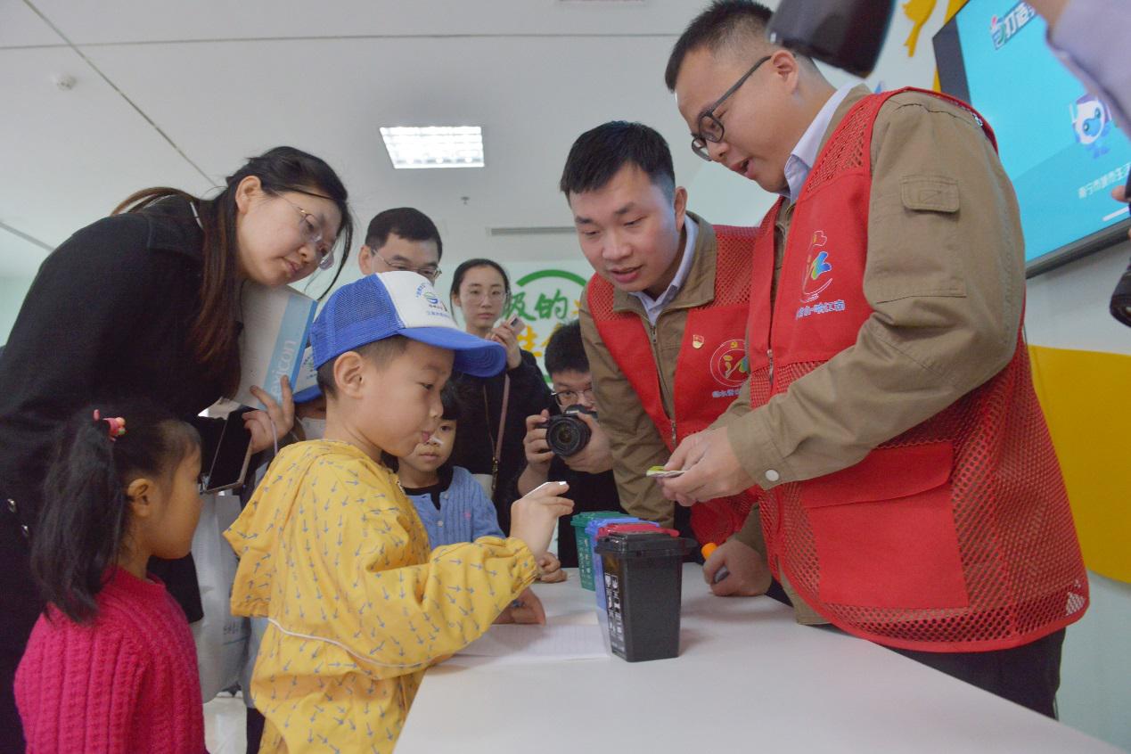在水科普館,孩子們與講解員一起參與了水科學小實驗,通過親自動手操作凈水科學實驗,更直觀地感受到“干凈水”的由來。在垃圾分類宣傳陣地,孩子們利用陣地中的道具開展垃圾分類競賽游戲,在歡聲笑語中加深了對垃圾分類的認識。